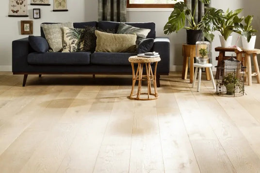 De trend van natuurlijk en duurzaam, dat zie je in deze sfeervolle woonkamer terug. Een mix van natuur- en aardetinten gecombineerd met materialen als hout, bamboe, riet, linnen en planten geeft je kamer een bohemian, vintage twist. Een vloer die thuishoort in die vibe is lamelparket. De brede planken komen tegemoet aan de robuuste trend die we nu zien als het om vloeren gaat. Parket is een natuurlijk materiaal door een toplaag van echt hout. Omdat je geen massief houten vloer in huis haalt is de vloer stabieler, super geschikt voor vloerverwarming en veel voordeliger dan een echte houten vloer. Daar wordt niet alleen jouw portemonnee maar onze groene wereld blij van. Win, win! Klik hier en bekijk de mogelijkheden van deze parketvloer.
